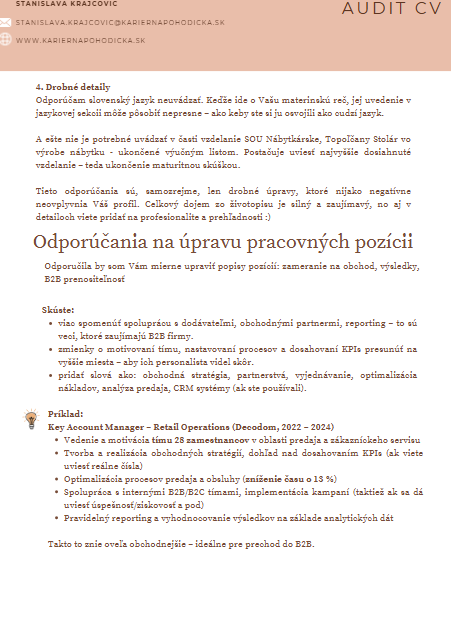 Ako HR špecialistka s viac ako 10-ročnou praxou viem presne, čo personalisti hľadajú, čo ich zaujme – a čo naopak odradí. Preto ti ponúkam audit životopisu na mieru, vďaka ktorému získaš spätnú väzbu a odporúčania priamo z praxe.
